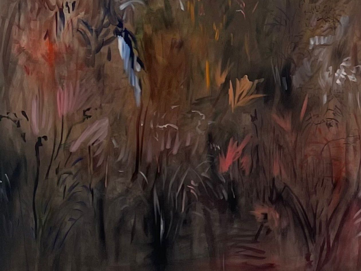 Margem rebuscada, cheia de arranjos pictóricos, flores selvagens que vão surgindo em várias alturas. Pincelas e tons sobrepostos, uns maiores, correm com a ponta do pincel, em linhas geográficas. Nos fundos escuros pigmentos claros fazem contrastes, nos tons terrosos, o rosa e vermelho se misturam como se emergissem de outras camadas. A cada canto da obra detalhes, espécies de floras que fazem o olhar ir navegando, encontrando novos tipos de flores, novas cores, novas texturas, novos claros e escuros, pequenos habitats em cada parte da obra. De longe, é visível a água, o rio que passa por baixo da mata. Mata mais densa, escura, não muito alta, o céu é claro ao fundo no alto da tela, sombras e galhos. Algumas cores fortes se destacam no empuxo das linhas da paisagem, os tons vão se diferenciando e mudando as cores, mas a atmosfera é a margem de um rio florida e sombria ao mesmo tempo. Num tempo que não existe no agora, pode ter pertencido a um passado ou vem num futuro qualquer de um lugar que resistiu ou persiste.