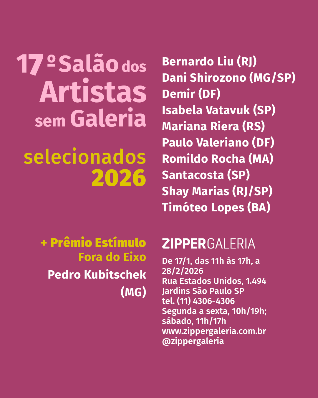 Com estes novos nomes da arte contemporânea brasileira, a galeria aposta no preenchimento de intenções múltiplas, por vezes em conflito, sem preocupar-se em apaziguá-las. Das QUASE noventa obras expostas na edição 2025 emana o caos e a denúncia de que se há ordem no mundo ela não é uma, nem tampouco una.